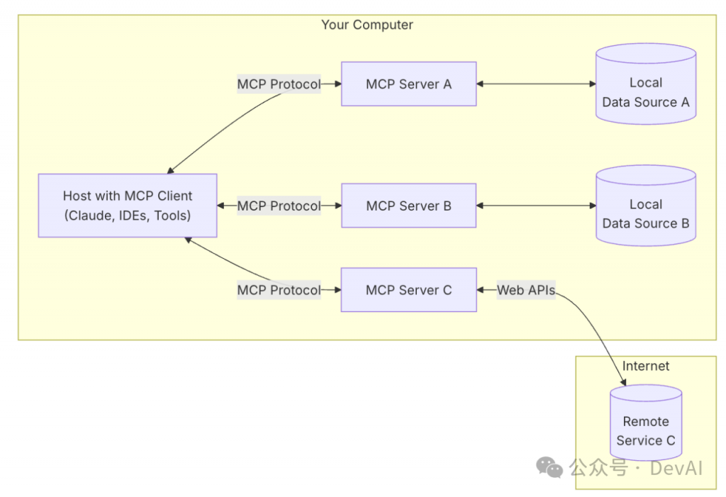 这种架构设计使得 Claude 可以在不同场景下灵活调用各种工具和数据源,而开发者只需专注于开发对应的 MCP Server,无需关心 Host 和 Client 的实现细节。