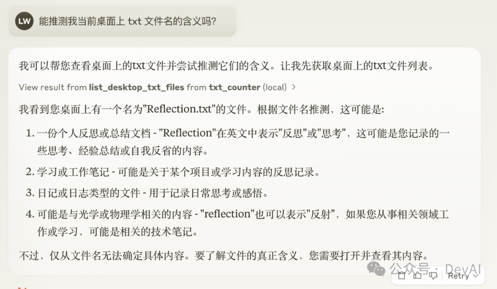 3. Server:在这个例子中,文件系统 MCP Server 会被调用。它负责执行实际的文件扫描操作,访问你的桌面目录,并返回找到的文档列表。