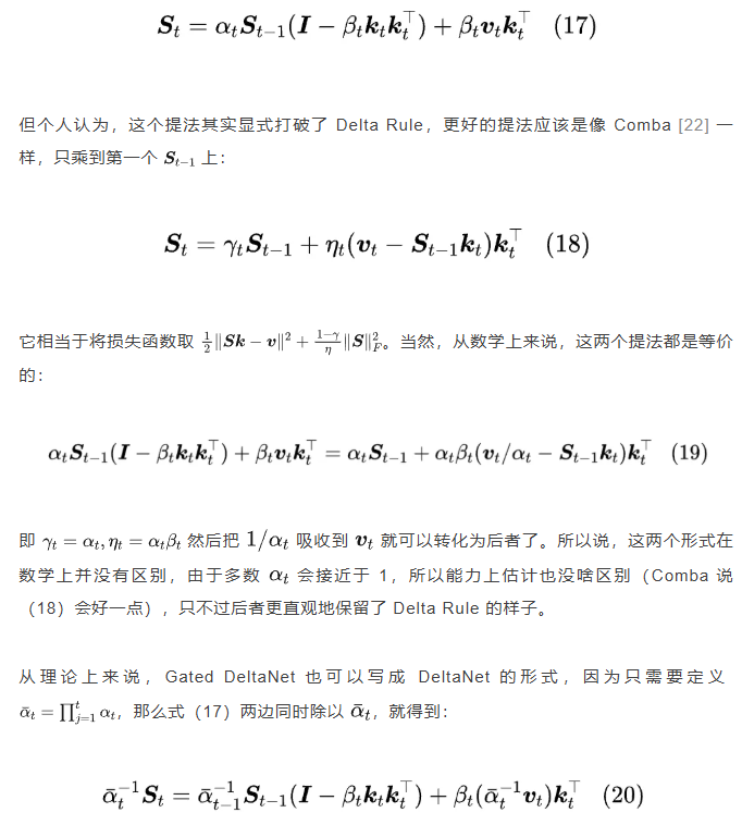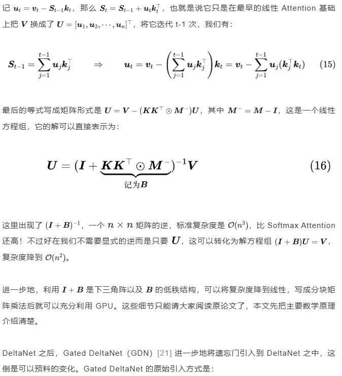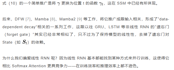 这反过来对模型提出了要求,如只有外积形式的遗忘门才能实现这个目的,典型反例就是 Mamba,它是非外积的遗忘门,无法充分发挥 GPU 的性能,所以才有了后续 Mamba2 和 GLA [11] 等变化。
