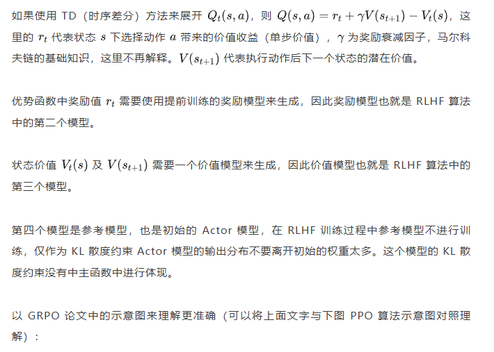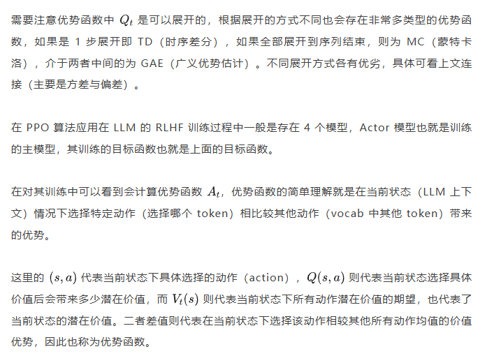 其实上面这个观点如果站在未简化的强化学习算法的角度上来讲(PPO 或者 A2C),优势应该是动作级别的,但是对于 LLM 的自回归输出场景来说动作级别的优势是不太容易计算的,上面介绍 RLHF 的时候也提到了,需要有奖励模型和价值模型。