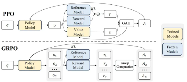 可以看到 PPO 算法涉及到了 4 个模型,更主要的是奖励模型需要提前进行训练,而价值模型也是一个 LLM,这就造成两个问题。
