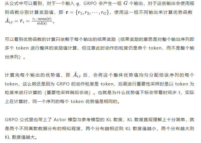 PPO 中奖励模型更换成了特定的规则函数来进行奖励值打分,PPO 中的价值模型则直接取消,优势函数的计算更换成了 LLM 一组输出的奖励值标准化的形式。