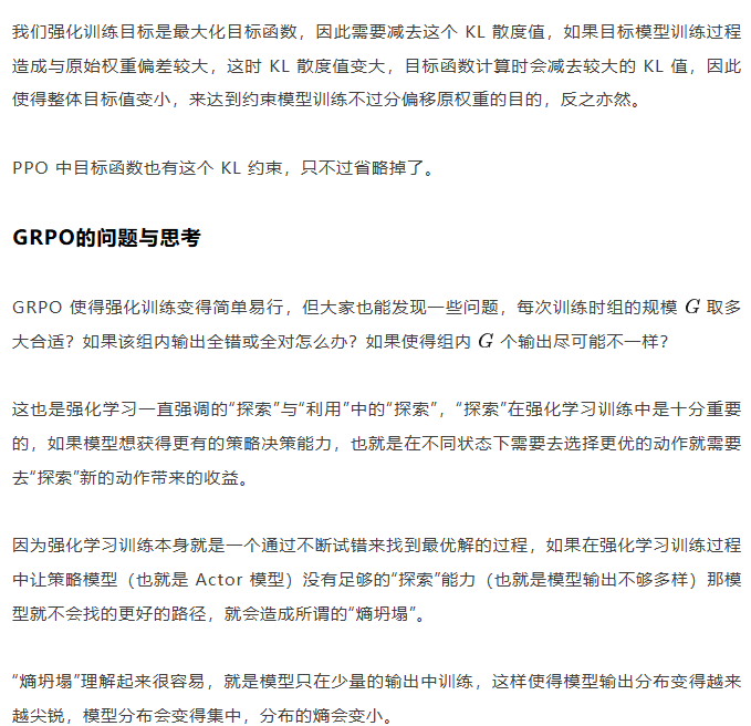 上面的 PPO 及 GRPO 目标函数中都存在 Actor 模型与参考模型的 KL 散度,KL 散度的意义也说过了,就是不想让训练的模型与最初始模型分布差距太大。