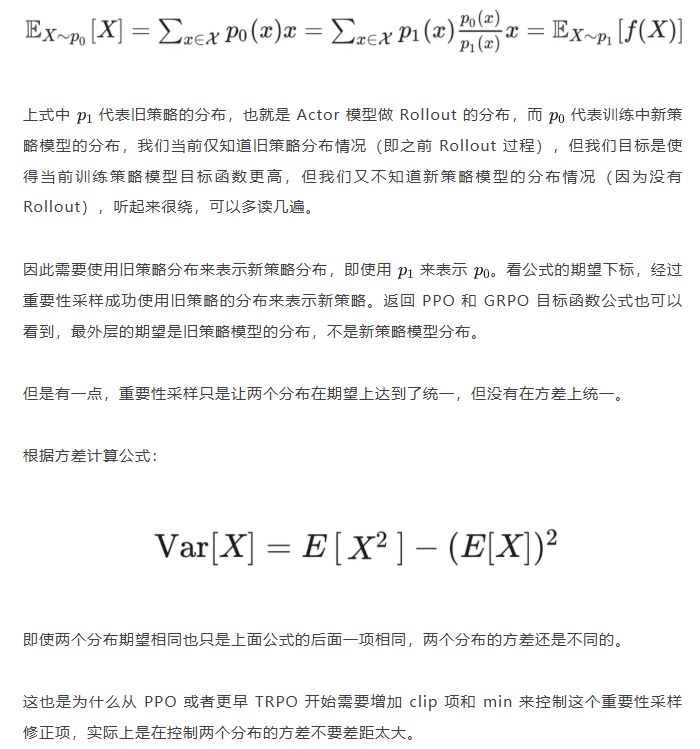 但 GRPO 中的重要性采样修正项是如何计算的呢?它是计算新旧两个模型在某个 token 位置输出一个特定 token 的概率,使用这 1 个特定 token 样本的概率来代替该 token 位置的整个动作空间分布的概率,这样就极容易造成方差偏移的问题(这是上面介绍重要性采样方差公式的具体场景)。