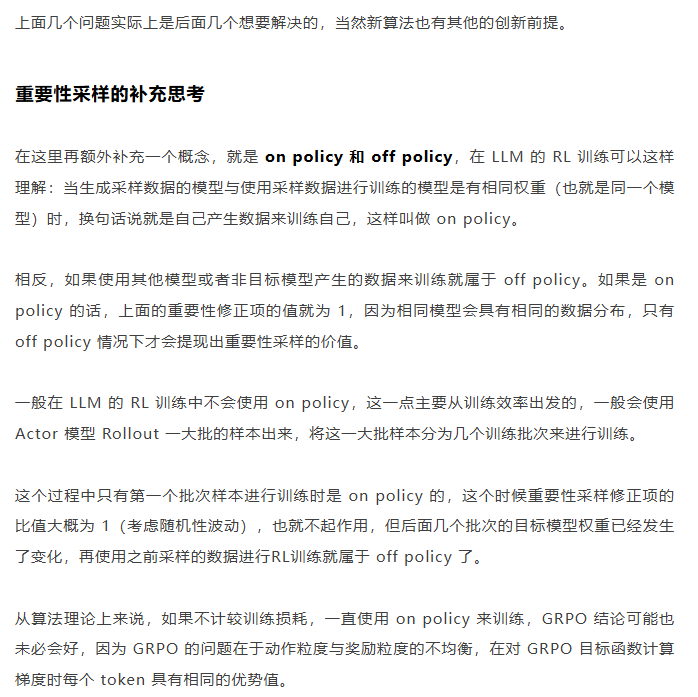 GRPO 这个问题的影响是长 token 序列的训练中每个 token 的修正幅度慢,比如对于长思维链的输出,假如最终推导结果正确,无论思维的过程很优质还是思维过程很差,该组的训练都不会对中间过程的 token 有较大的修正,比如优质内容的 token 采样概率应该增大,很差的思维过程 token 采样概率应该减小。