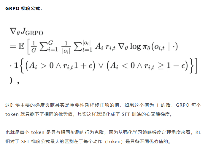 就比如重要性采样思考中提到的如果使用 GRPO 进行 on policy 训练,当不可以重要性采样修正项时,从目标函数梯度上看 GRPO 的 on policy 训练就成了 SFT 训练,对每个 token 一视同仁。