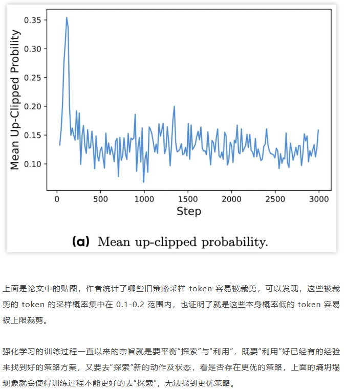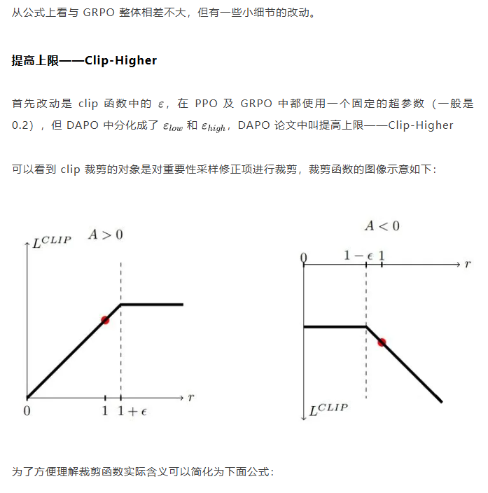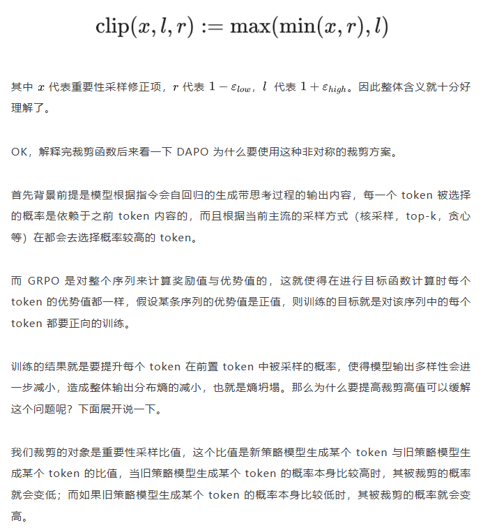 而且从梯度公式后面看到(大括号内)一旦该 token 的重要性采样修正项被 clip 裁剪,那么这个 token 实际上对于梯度更新是没有任何作用的,也就是说被裁剪的 token 实际上对于 GRPO 训练没有任何帮助,从这一点上来重新思考 DAPO 去提升 Clip 裁剪上限也是有意义的。