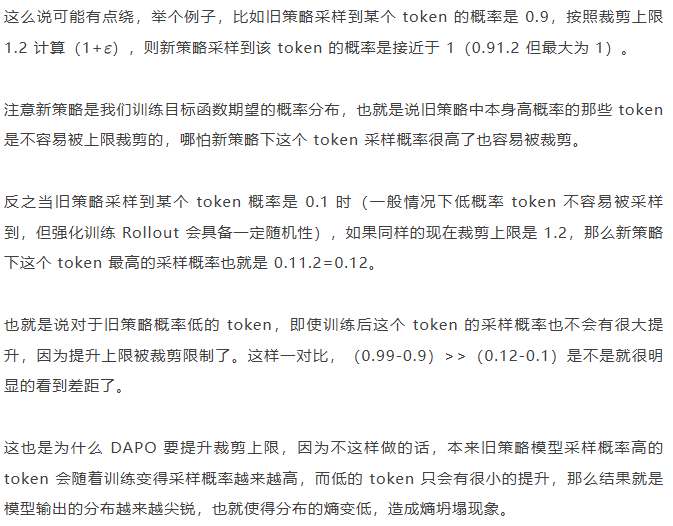 另外 DAPO 应对的场景是长 COT 场景, 也就是带思考模式的输出情况(上面也提到,当生成序列如果很长,重要性采样修正项会造成方差偏移的累积)。