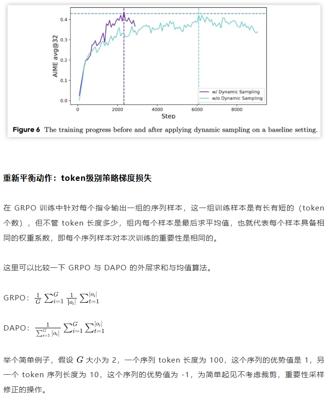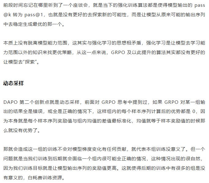 关于解决这个问题 DAPO 也是简单粗暴,对于批次内生成的组内序列全部正确或错误的指令直接剔除掉,使用新的输出组中不全是错误或正确的指令来补充上,直到补全这个批次。