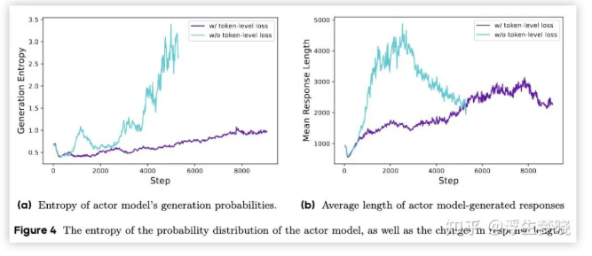 上图是对照实验,紫色是 DAPO 在 token 级别计算损失,蓝色是样本级别计算损失,可以明显看到紫色曲线无论生成分布的熵值还是输出内容长度都更平稳。