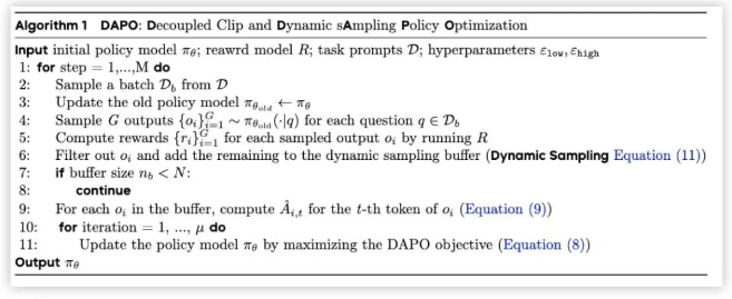 DAPO 是字节的工作,因此开源代码也就使用的 verl,其针对 GRPO 存在的问题提出来解耦裁剪和动态采样策略优化(Dynamic sAmpling Policy Optimization DAPO)。