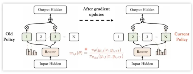 区别在于新旧两个模型在进行序列中每个 token 概率计算时会被专家路由器路由到不同的专家模块,这样的话会造成重要性采样修正项变得极其不稳定,很容易被裁剪,被裁剪就会使得这个 token 在训练中没有任何的梯度贡献。