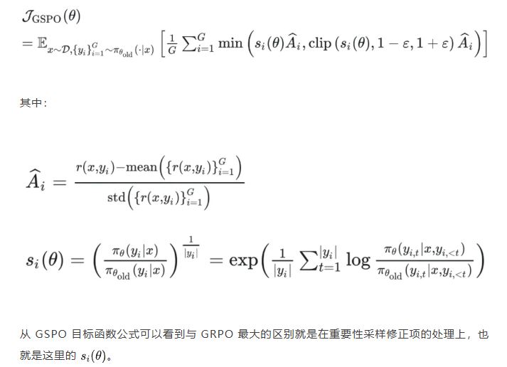 GSPO 全称是 Group Sequence Policy Optimization,组序列策略优化。是qwen3 团队的工作,该工作也是对 GRPO 的改进,不同于 DAPO 是应对带思考的长文本场景,GSPO 应对的场景是 MOE 模型的训练(当然还有对 GRPO 算法的一般性改进,参考前文 GRPO 的思考)。