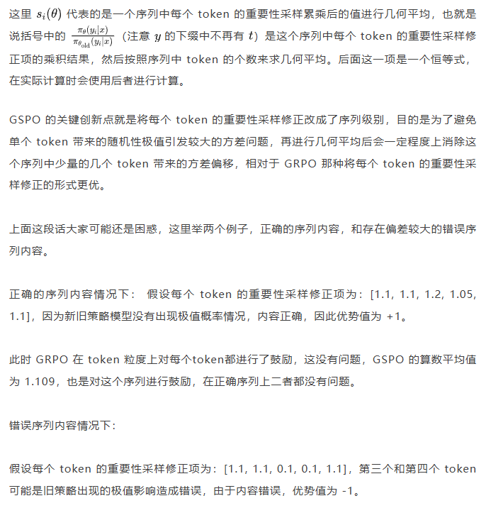 也就是重要性采样修正不再对应 token 级别,而是对应序列级别,这也是 GSPO 做的工作。