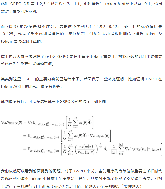 至于 GSPO 后面提到的 GSPO-token,个人感觉没有太大分析的必要,只是又从 token 角度上推导了一下公式,理解上没有什么区别。
