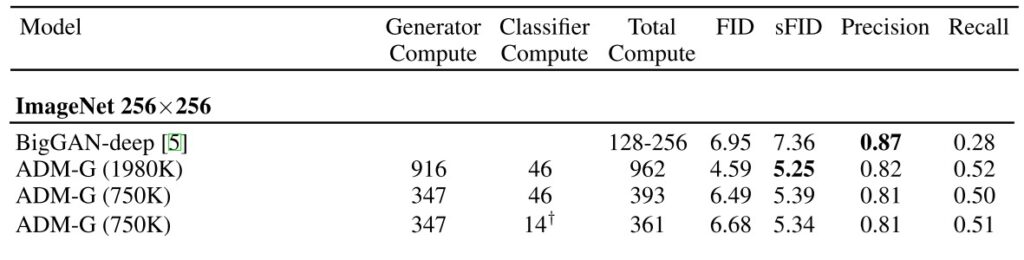 自从被提出以来,扩散模型最遭人诟病之处就是它的计算效率:无论是训练和推理,扩散模型都比之前的 GAN 要慢很多。这可以从早期的 ADM 模型的实验表格中反映出来。ADM 模型出自大名鼎鼎的论文 “Diffusion Models Beat GANs on Image Synthesis”,这篇论文在扩散模型奠基之作 DDPM 的基础上对 U-Net 去噪网络略加优化,并提出了 Classifier Guidance 这种优化带约束生成 (conditional generation) 质量的方法。基于这些改进,论文在 ImageNet-256 上训练了一个进阶版 DDPM,也就是 ADM。它的结果如下,其中 Compute 的单位是 1 个 V100 运行一天能完成的计算量。
