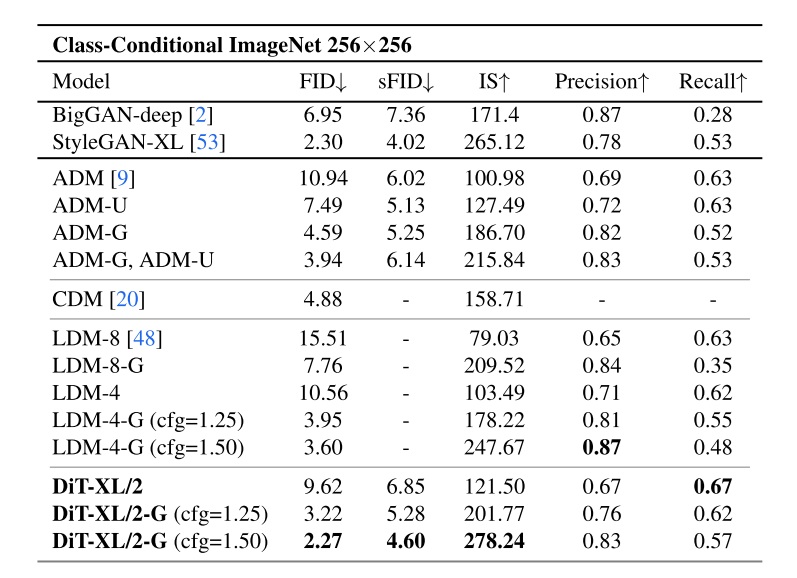在 DiT 论文的 ImageNet-256 benchmark 表格中,我们能看到 LDM 比像素空间的 ADM 更好,而用了 Transformer 的 DiT 比用 U-Net 的 LDM 更好。
