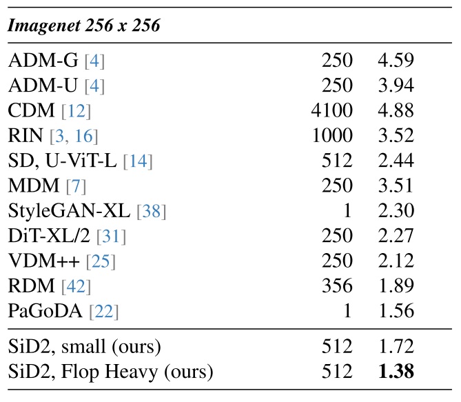 像素空间扩散模型 Simple Diffusion (SD) 以及 Simple Diffusion 2 (SiD2) 基于这一观察,调整了加噪的方式。此外,它们也把 U-Net 升级成了和 Transformer 更像的 U-ViT。最终,SiD2 在 ImageNet-256 benchmark 上取得了很不错的表现。