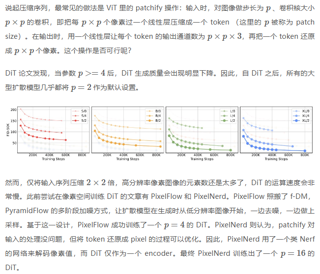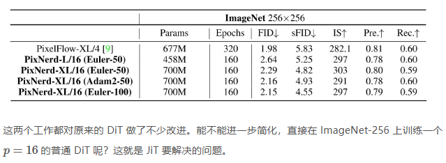 早期像素空间的 ADM 效果不够理想。LDM 通过加入潜空间来提升训练效率与生成质量,但它只是绕过而不是解决了长序列生成问题。ADM 的改进方向有两个:1)改进长序列下的加噪方法;2)从 U-Net 升级成 DiT。前者已经被成熟研究并广泛用于当前的大型扩散模型了。而 Pixel DiT 的研究还不够多,其瓶颈在于 patch size 过大时 DiT 生成质量会严重下降,必须加入一些额外的设计。而 JiT 试图训练一个不带任何额外设计,且 patch size 较大的 pixel DiT。