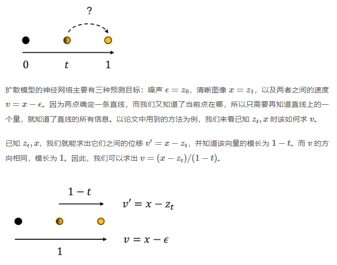 改完这个 bug 后,模型总算训起来了。但是,模型在采样时永远只能生成纯黑的图片。这又是哪错了呢?为了确保论文里的速度和我代码库的速度的定义一致,我自己推导了一遍 x 和 v 的转化公式。最后发现,速度的定义没错,论文里 t 的定义和我这里是反过来的!我用的 Diffusers 库坚守 DDPM 的老传统,把 t=0 当成清晰图像,t=1 当成纯噪声。不知道哪个发明流匹配的人硬生生把这个定义反了过来。太烦人了!