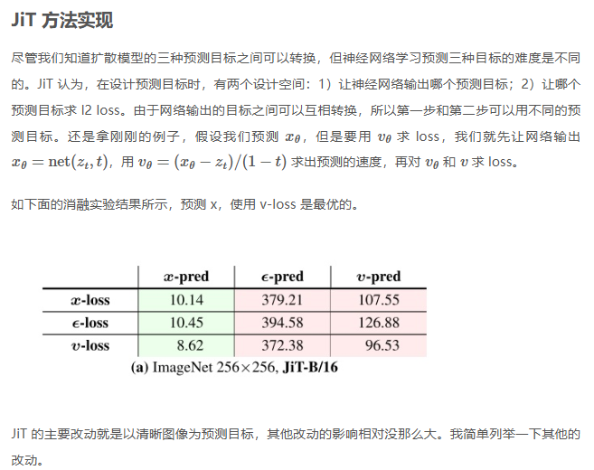JiT 的主要改动就是以清晰图像为预测目标,其他改动的影响相对没那么大。我简单列举一下其他的改动。