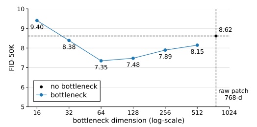 Bottleneck 嵌入层。原来 DiT 在将输入通道数变成模型通道数时,只会用一个普通的线性层。而 JiT 把它换成了一个双层 bottleneck 结构:先降维,再升维到模型通道数。这个模型设计上的小改动也能提升生成质量。