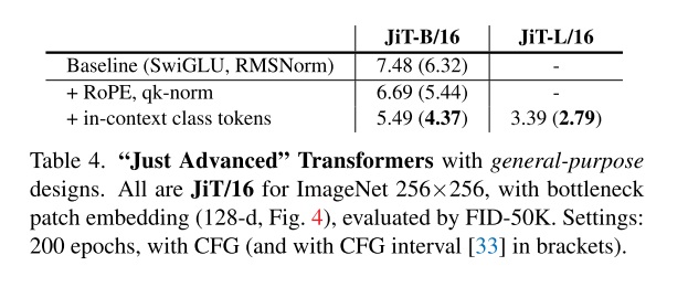 现代 DiT 结构。JiT 参考之前的 LightningDiT (即提出了 VAVAE 的论文),对 DiT 的模块进行了改进,使用了 SwiGLU, RMSNorm,并将位置编码换成了 RoPE,还加入了 qk-norm。