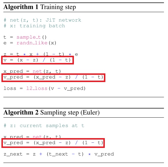 在我的训练环境里,我已经准备好了 FFHQ-128 数据集及一个加入了 RoPE 的流匹配版 DiT。我想快速验证一下预测清晰图像这件事能带来多大的提升。恰好,JiT 论文正文给出了 Python 风格的伪代码简明实现,我就直接把它搬进我的代码了。如果已经准备好了 v-prediciton 的训练环境,只需要按照下图红框所示,稍微改几行代码,就能预测清晰图像并启用 v loss 了。