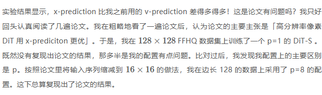 这样看来,我对论文的结论理解似乎有误。论文的真正结论应该是「大 patch size 的 DiT 用 x-prediciton 更优」,和分辨率究竟多大,以及是否是像素 DiT 无关。