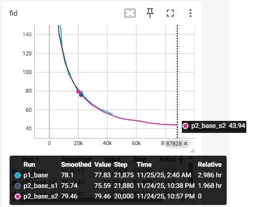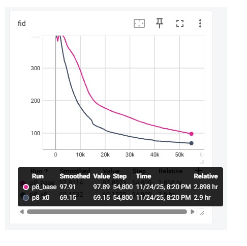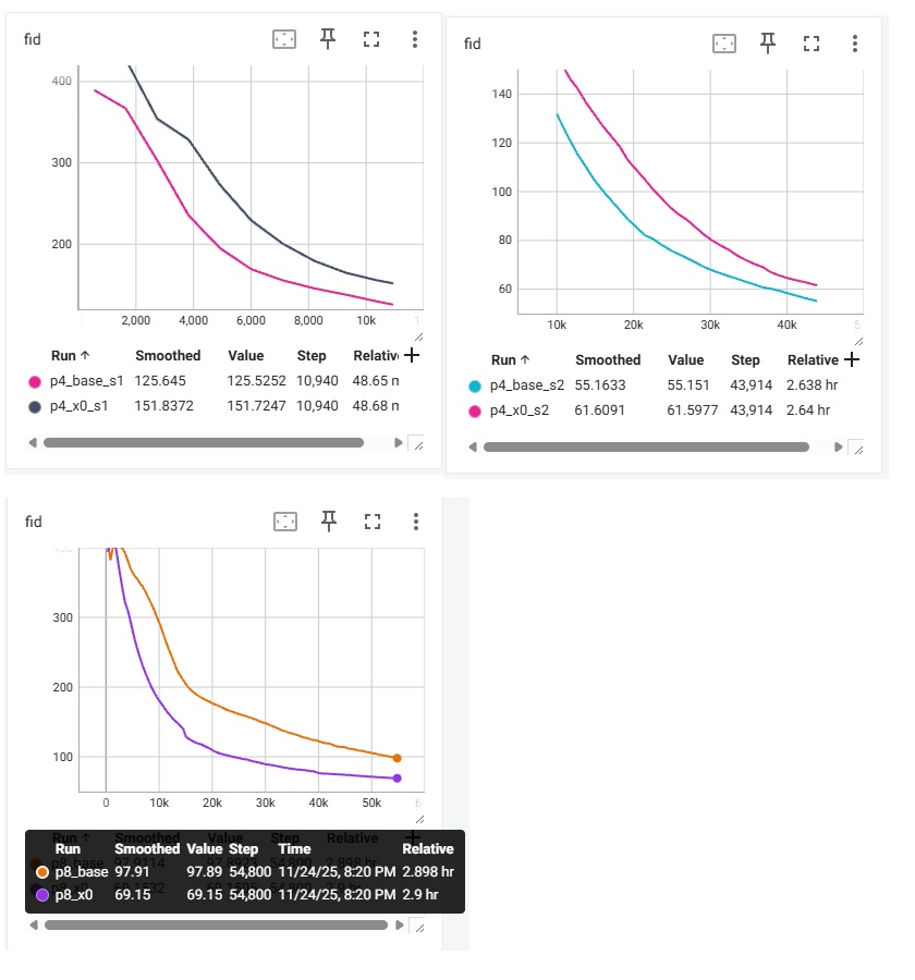 如下图所示,_base 指的是用 v-predition 的 baseline,_x0 指的是 JiT 最终采用的 x-prediction + v loss。我这里输出的是 1000 个样本的 FID 指标 (越低越好)。训练一共执行 200 个 epoch,batch size 为 256。