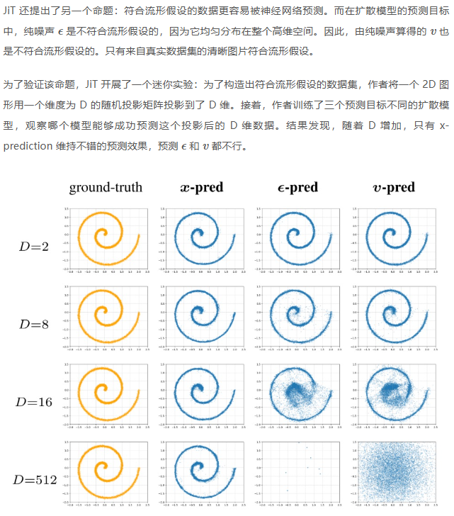 此前大家没能成功训练出 ImageNet-256 上 p=16 的 DiT。JiT 用 x-prediction 取代 v-prediction 解决了此问题。这一做法背后的理论基础是流形假设和神经网络的 factorization: 神经网络将预测复杂分布分解成了预测每一个简单元素的分布,而 patchify 把原本低维的元素变成了高维的元素。此时,如果在预测目标中加入噪声,就会违反流形假设,让模型要学习的高维数据分布过于复杂。