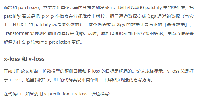 通过这些实验,我可以断言,JIT 提出的扩散模型预测目标仅在大 patch size 下有效。这个方法仅仅是不得不用大 patch size 时的无奈之举。如果计算资源足够,用原来 v-prediction 的小 patch size 模型还是更好的。