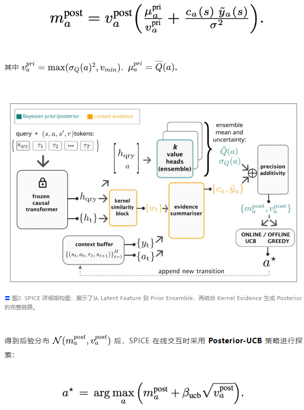 在测试时(Test-time),通过显式的贝叶斯公式将这个先验与上下文证据融合,利用 UCB(置信上界)算法进行决策。