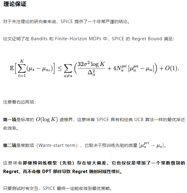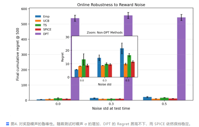 即便是在预训练数据质量极差的情况下,SPICE 依然在理论上被证明具有对数级遗憾界 (Logarithmic Regret),并在实验中展现出显著优于 DPT 等基线模型的性能。
