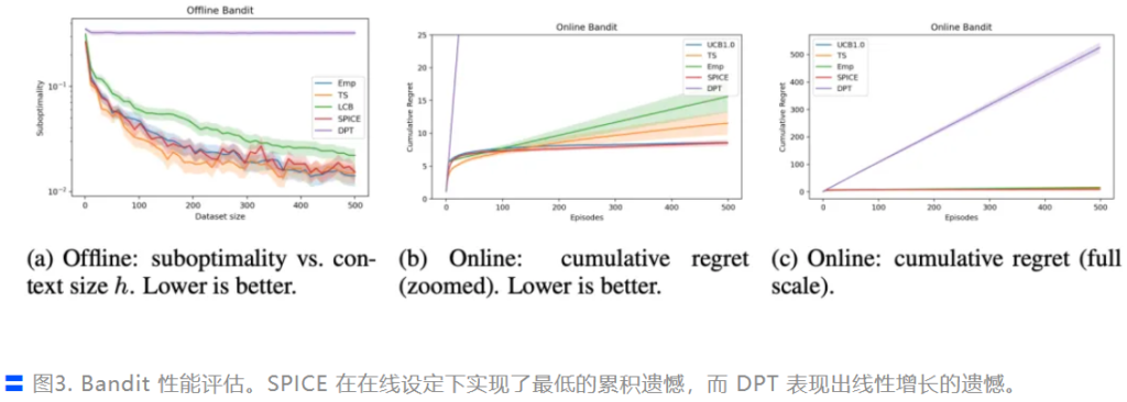 相比之下,DPT 的最终遗憾值比 SPICE 高出两个数量级,这表明 DPT 未能从微弱的日志数据中适应,而 SPICE 真正实现了 In-Context 的策略改进。