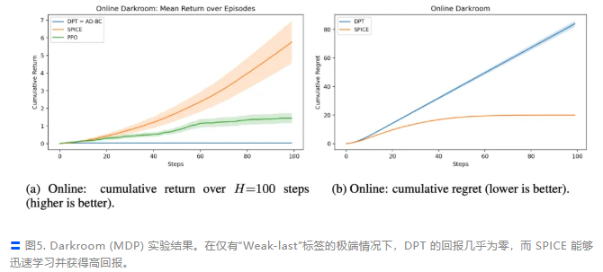 在 Darkroom 这种涉及序列决策的任务中,实验结果显示 SPICE 能够迅速适应环境并获得高回报,其遗憾曲线在短暂的热身(Warm-up)后迅速趋于平缓。