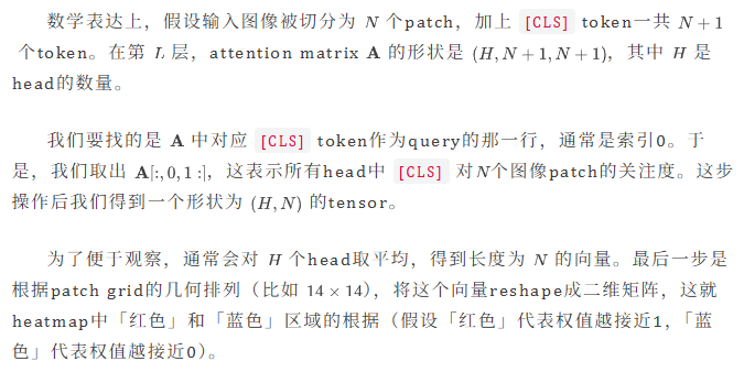 而可视化这一过程的逻辑在于:我们只需要拿到这个权重向量,把它从一维序列还原回二维的grid结构,再插值上采样放大覆盖在原图上,就能得到直观的heatmap——这也是我们最为常见的ViT注意力的可视化形式。